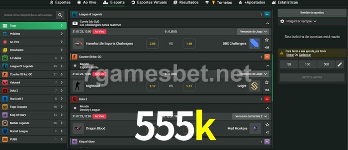 O 555k oferece uma grande seleção de opções de apostas em e-sports com probabilidades competitivas